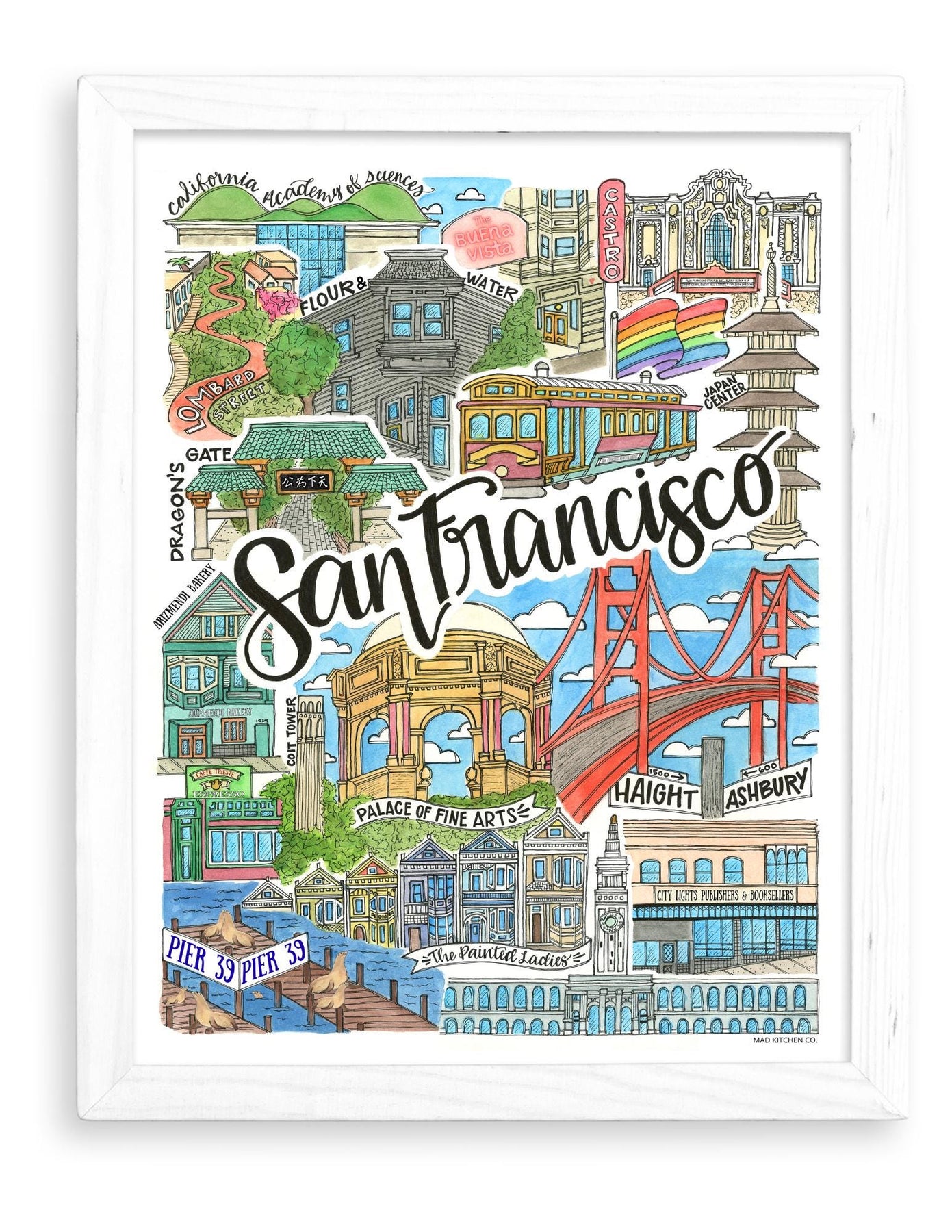 This print includes representations of the California Academy of Sciences, Dragon's Gate, Japan Center, The Buena Vista Cafe, SF Trolley, Flour & Water, The Castro Theatre, Lombard Street, Arizmendi Bakery, Coit Tower, the Painted Ladies, Pier 39, Cafe Trieste, Haight Ashbury, The Ferry Building, the Golden Gate Bridge and the Palace of Fine Arts.